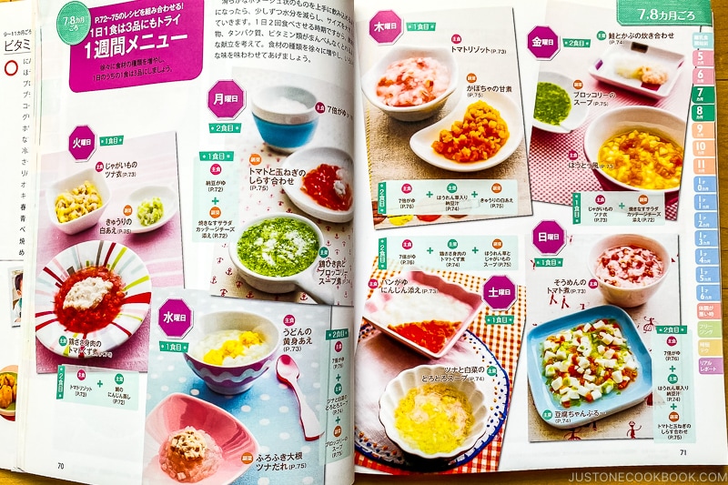Baby food in Japanese is called Rinyushoku (離乳食; literally “food separated from milk,” refers to food given to a baby between 5/6mo to 18mo). In Japan, babies typically begin eating solids after the 5-6 month checkup.
