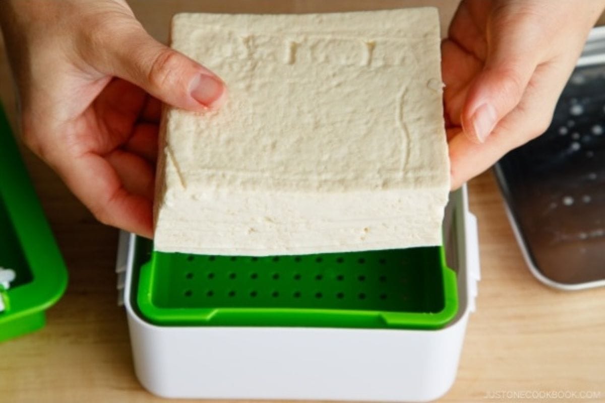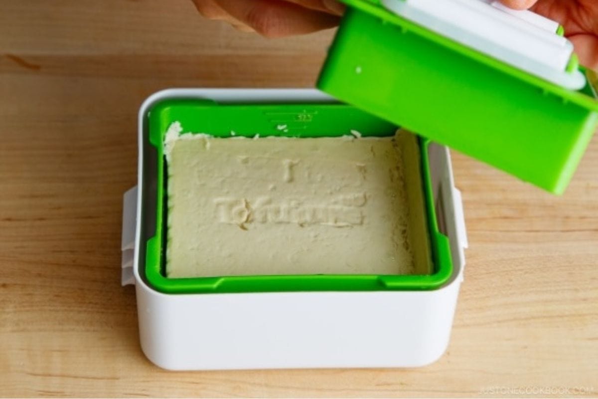 The tofu is held on a removable plate, which can be pulled out to double as a cutting board for the pressed tofu, and the container can double as a place to marinate the tofu.