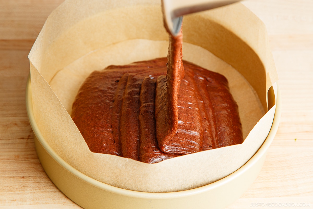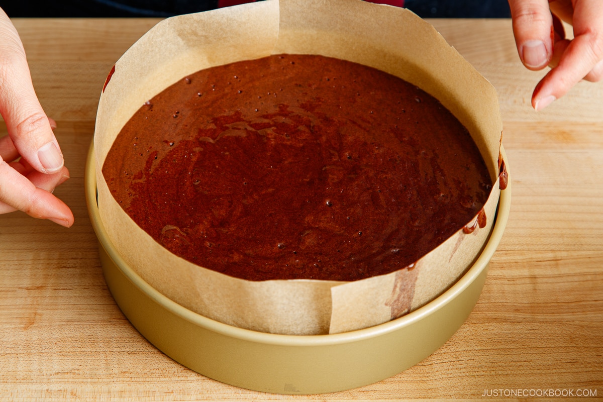 - Line the 8-inch (20-cm) round cake pan with parchment paper. I’ll show you my trick later in the post. Also, use a light-colored cake pan for the best outcome. Avoid using a dark-colored pan because it will absorb heat faster and more intensely and your cake will bake more quickly, possibly overbake, and may even burn. If you must use a dark pan, reduce the oven temperature by 25°F (15°C) and check for doneness 10 minutes sooner than the instructions indicate.