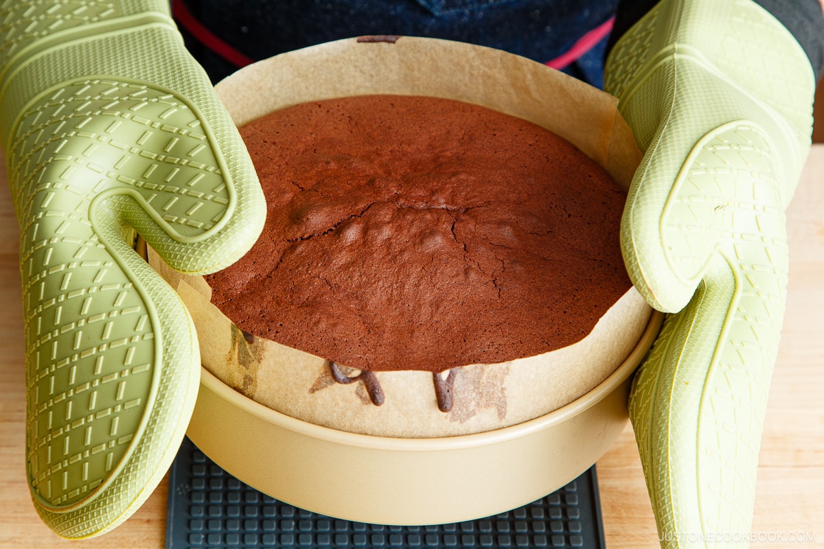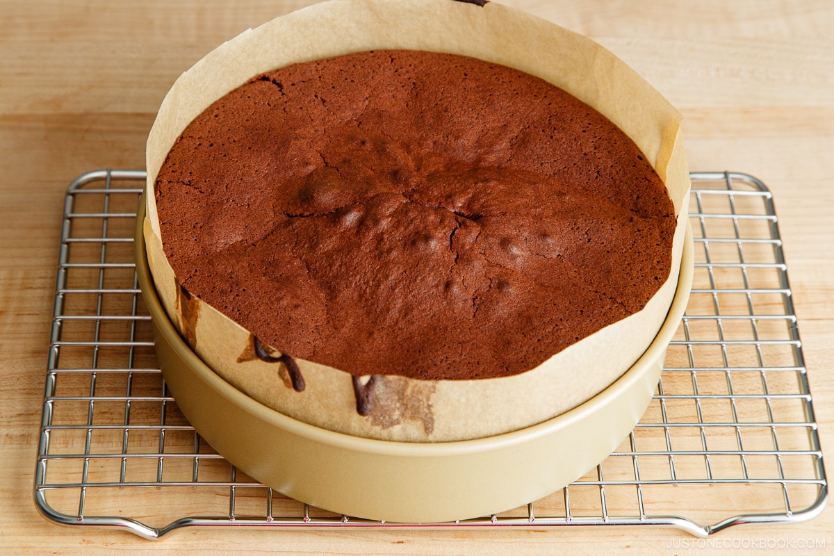 - When the cake is done, remove it from the oven and firmly drop the cake pan on the countertop to allow the water vapors to escape. Place the pan on a cooling rack and let the cake cool completely in the pan. As the cake cools, it may deflate a bit. For the best flavor and texture, wrap the cake (still in the pan) well so the moisture doesn‘t escape, then store it in the refrigerator overnight.