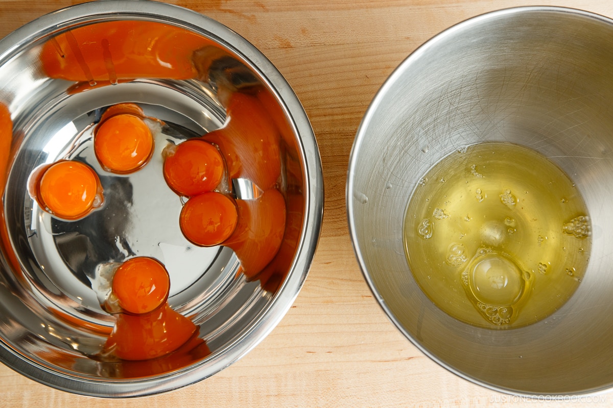- Beat the egg whites until they form very soft peaks. When lifting the beaten egg whites with the whisk, they should be soft enough to drop a few times and then stop; they should not be runny. This process is a bit different from making Chiffon Cake and Japanese Cheesecake, so be careful not to overbeat the egg whites.
