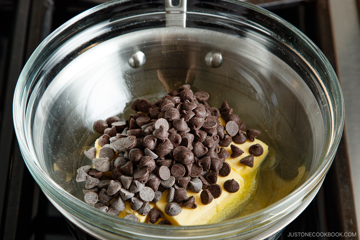 - Add the butter and ¾ cup chocolate chips to the glass bowl. Stir occasionally until the chocolate is melted. Meanwhile, prepare the egg yolk mixture in the next step. Tip: Make sure not to introduce any moisture to the bowl; otherwise, the chocolate will seize.