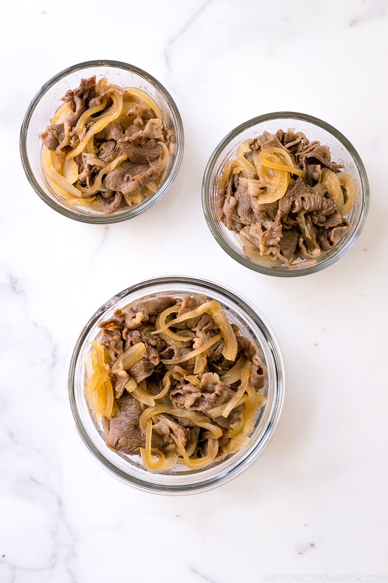 To make it easy, I have different-sized containers for a bento portion, 1 serving of rice, and 2 servings of rice. It’s easy to take it out and pop it in the microwave to defrost the frozen rice in the morning. Once the rice is warmed through, pack it in bento boxes or make rice balls (onigiri).