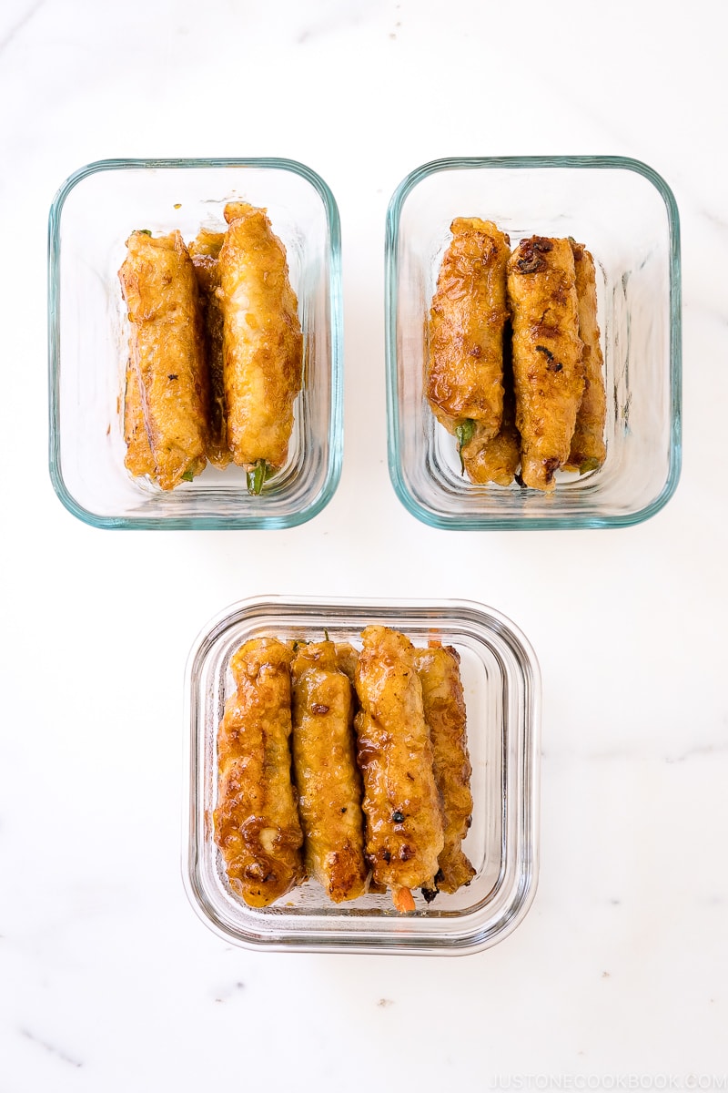 Use airtight glass containers so you can microwave them. When reheating, remove the plastic cover and place a sheet of paper towel on top to avoid oil splatter and maintain the moisture in the food.