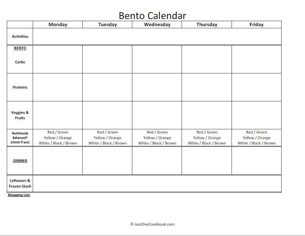 A friend of mine in Japan uses a meal planner to organize her dinner and bento menus. I adapted hers and made a simplified Bento Calendar. With this calendar, you can visually plan out your weekly dinners and bento menus. If you would like a copy, please click here.