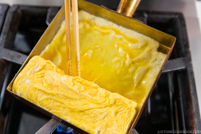 • When the egg is just set (the mixture is not runny but not cooked through), run your chopsticks along the edges to detach the egg from the pan‘s sides. Then, roll the egg toward you, starting from the far edge. If you use chopsticks, lift the frying pan toward you in a rolling motion to create momentum that will help you roll the egg. If you use a spatula, you may need to occasionally remove the pan from the heat so the bottom doesn’t get too hot.