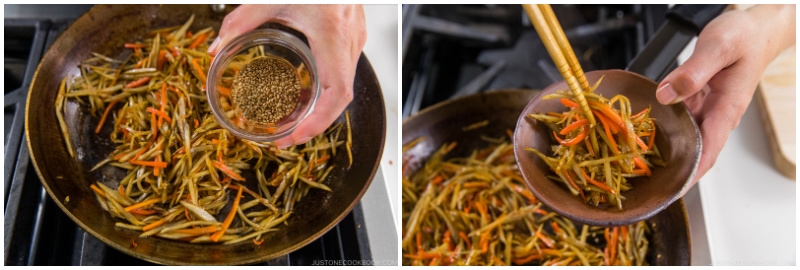 - Stir-fry the gobo first, until the texture is close to raw carrot texture. Then, add the carrot and cook until both are equally tender.
