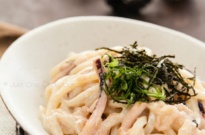 5. Add cooked udon and toss well until the udon is evenly coated with the sauce. Garnish the pasta with nori and shiso leaves.