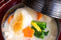 Ozoni is a special soup that we eat in the morning on New Year’s Day in Japan. It usually includes mochi (rice cake) and the preparation varies by household and region.