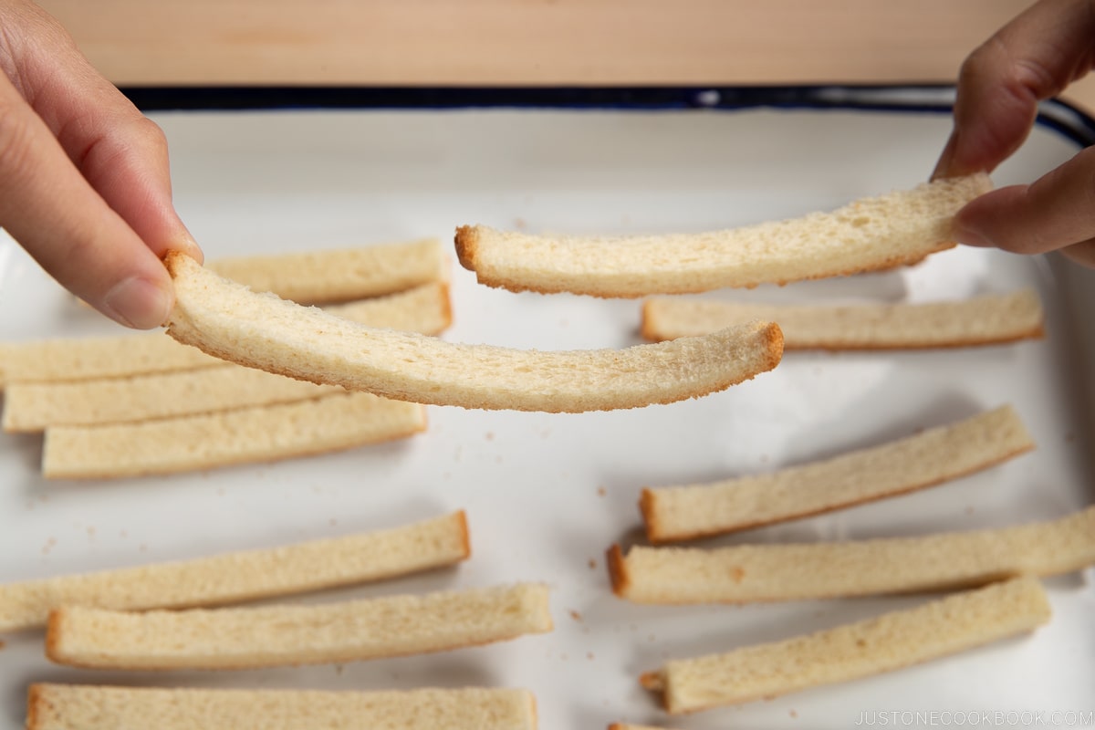 - 16 strips of crust from Japanese milk bread (cut the crusts off 4 slices of Japanese shokupan sandwich bread or use 2 end slices cut into 8 strips each; sandwich slices are typically precut to 10–12 slices per square loaf; you can also use frozen crusts and end-piece strips that you saved in the freezer)
