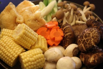 - First, add some of the hard/dense vegetables such as sweet corn, Tokyo negi (naga negi; long green onion), carrots, the white part of napa cabbage (near the root), shungiku (chrysanthemum greens) stems, shiitake mushrooms, enoki mushrooms, frozen dumpling, etc. Cook, covered, until boiling.