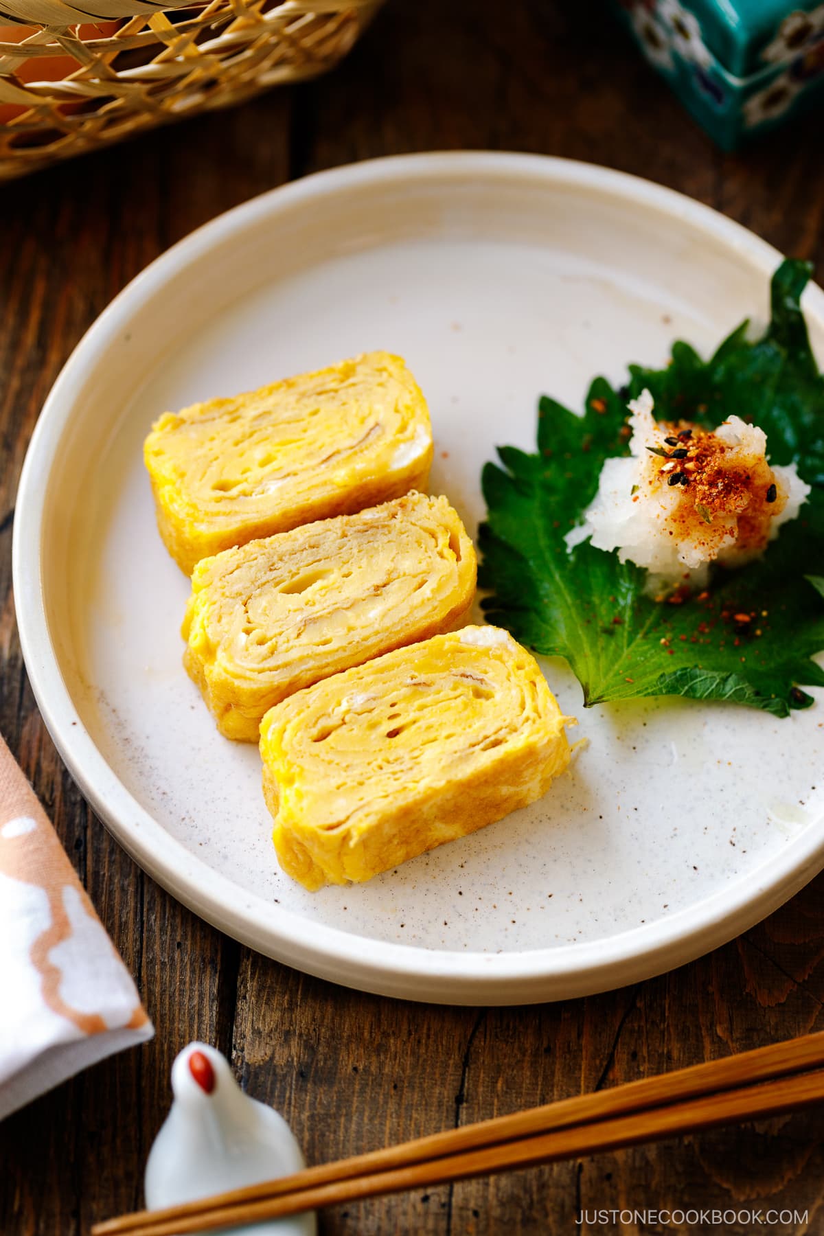 - Serve with grated daikon! While tamagoyaki can be enjoyed on its own, it is often served with grated daikon. For added flavor, drizzle soy sauce and, if desired, sprinkle optional shichimi togarashi.