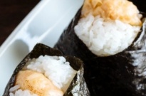 Tenmusu (天むす) are rice balls with shrimp tempura as a filling, wrapped with nori (seaweed). It has a distinctive look as it shows the part of shrimp tempura exposed at the top of the rice ball.