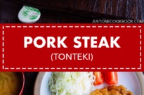 Tonteki is one of the simpler dishes featured in Midnight Diner; it is pan-seared pork loin steak. Ton (豚) means pork in Japanese, as you may already be familiar with Tonkatsu (pork cutlet) and Tonkotsu (pork broth), and -teki (テキ) comes from suteeki (ステーキ) which means steak in Japanese. For those of you who study/read Japanese, Tonteki トンテキ is sometimes written as とんテキ、豚てき、とんてき、豚テキ, with the different combination of hiragana, katakana, and kanji.